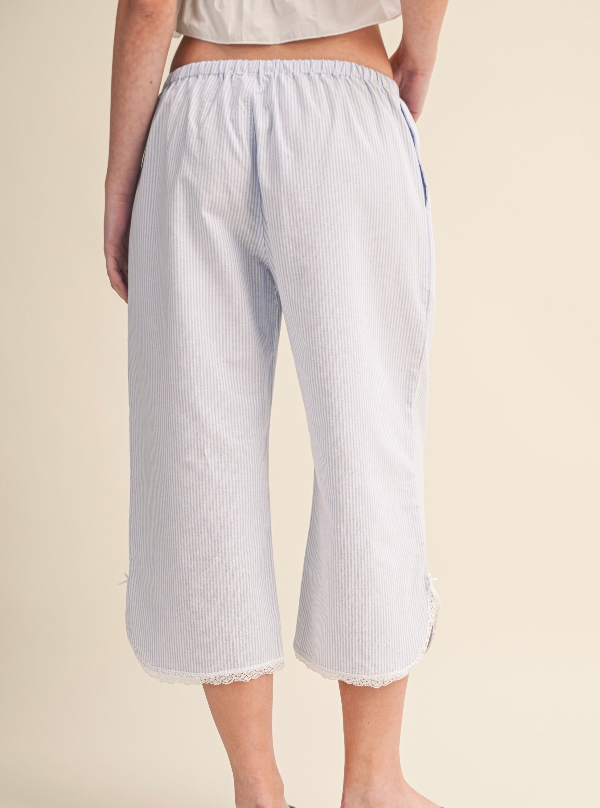 BLUE/WHITE PINSTRIPE BOXER PANTS WITH LACE TRIM