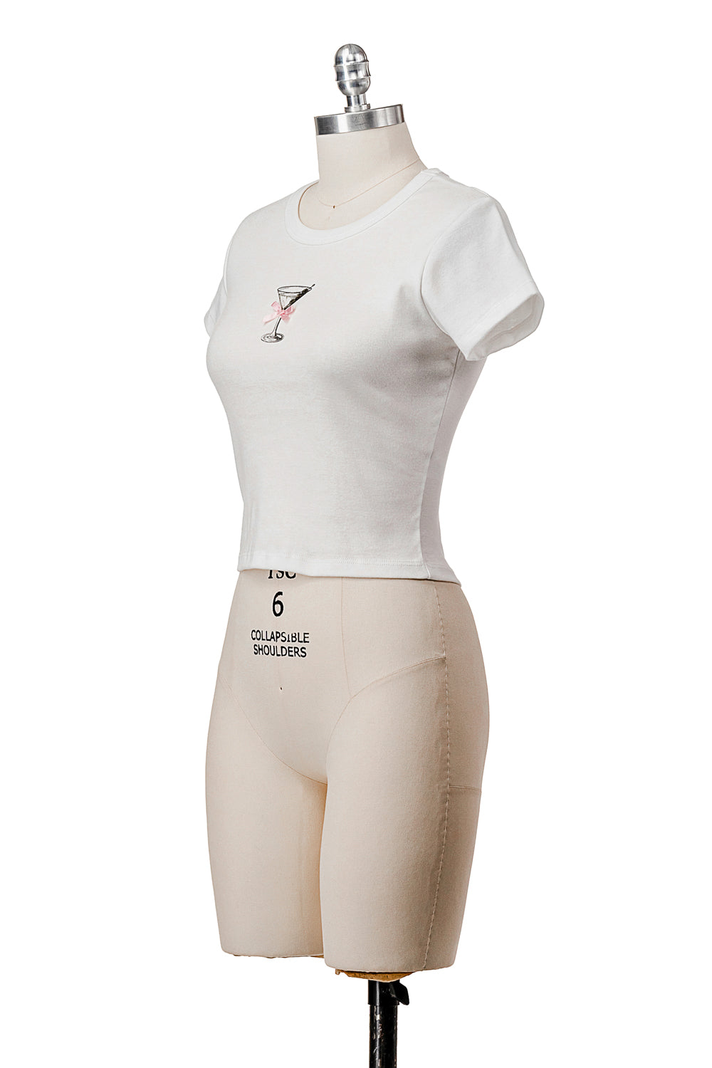 SHORT SLEEVE MARTINI BOW BABY TEE T-SHIRT WITH GRAPHIC AND RIBBON TRIM